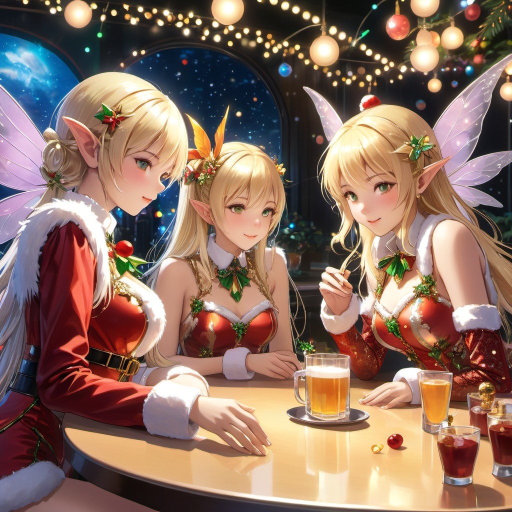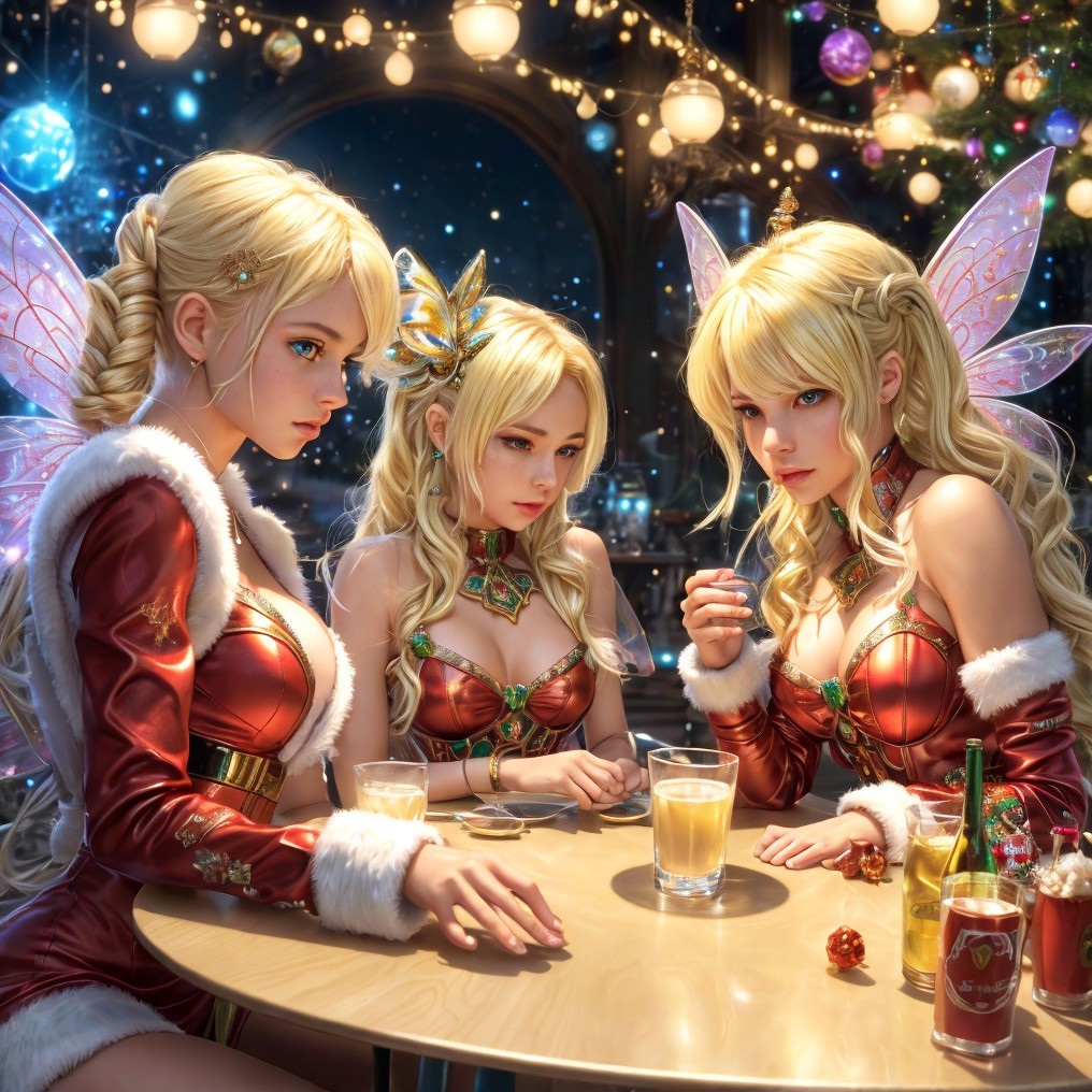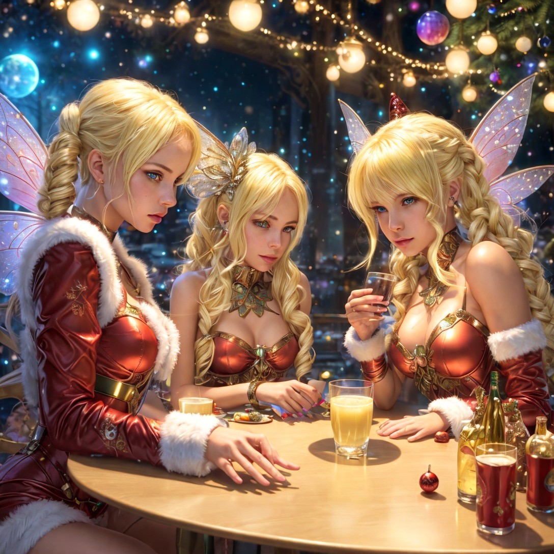 Fantasy Characters with Fairy Wings in Festive Attire at Sparkling Table