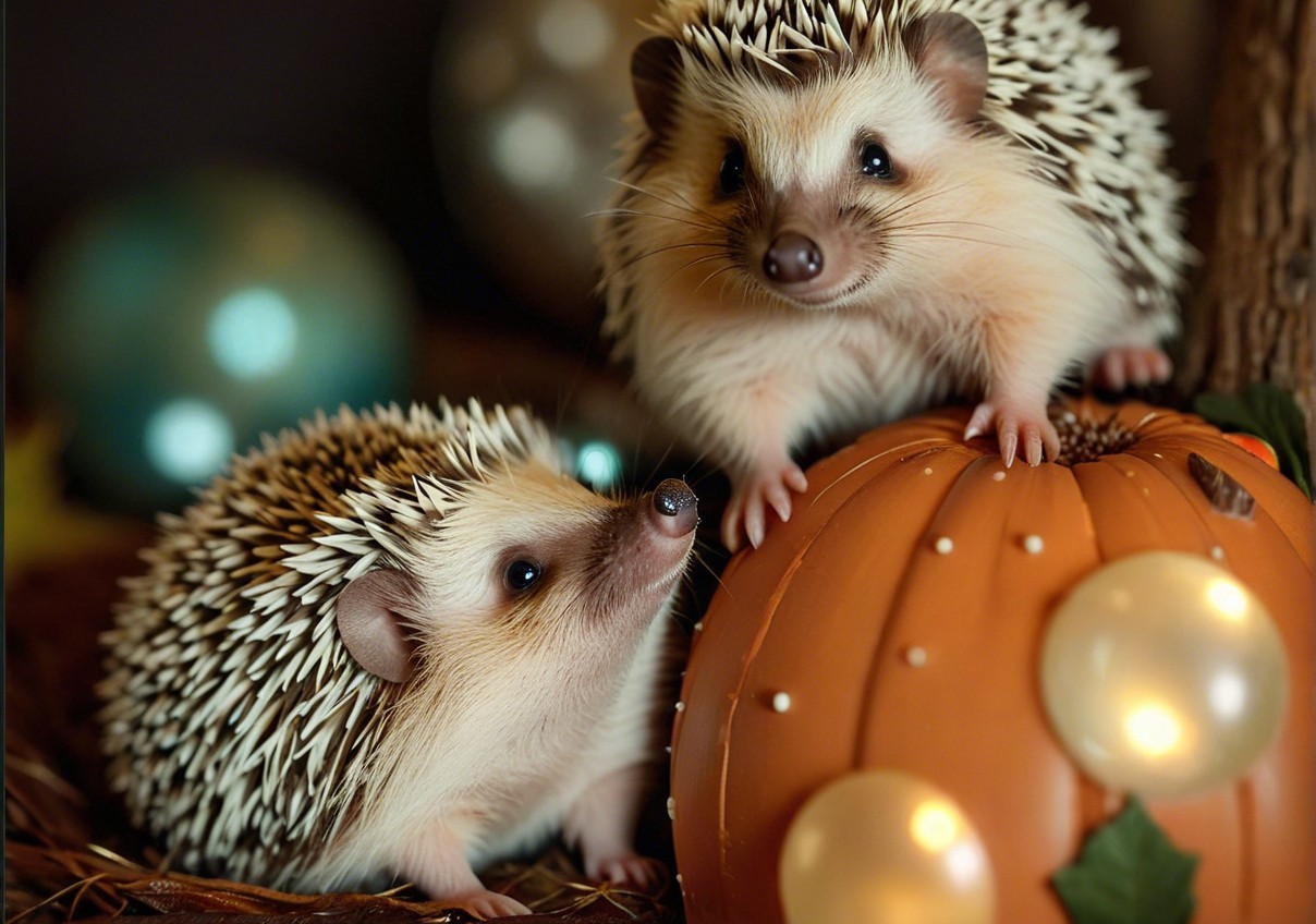 Two adorable hedgehogs are nestled among colorful pumpkins and leaves, one perched on a pumpkin while the other sits nearby, creating a charming autumn scene.