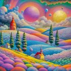 A vibrant landscape featuring rolling hills in hues of purple, pink, and green. Charming cottages dot the scene, framed by tall trees under a dramatic sunset with colorful clouds.
