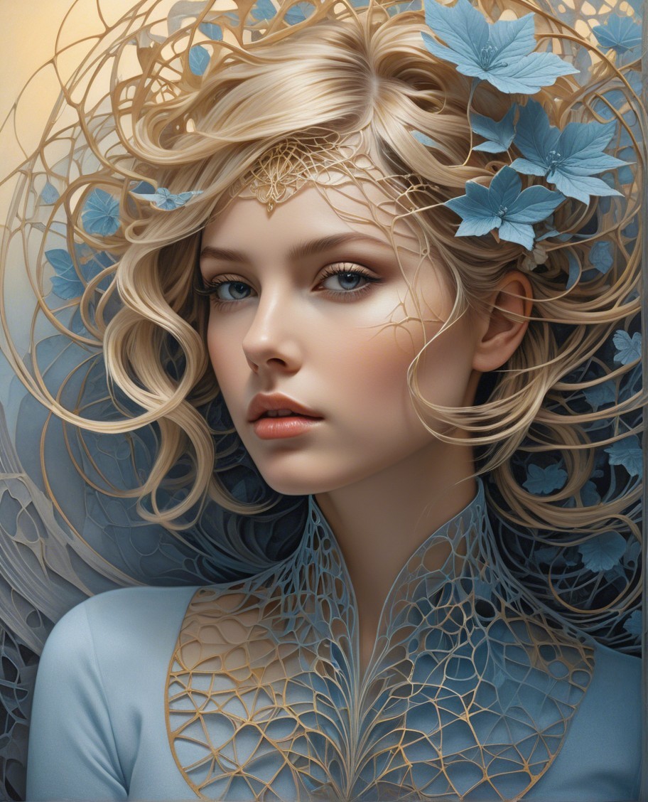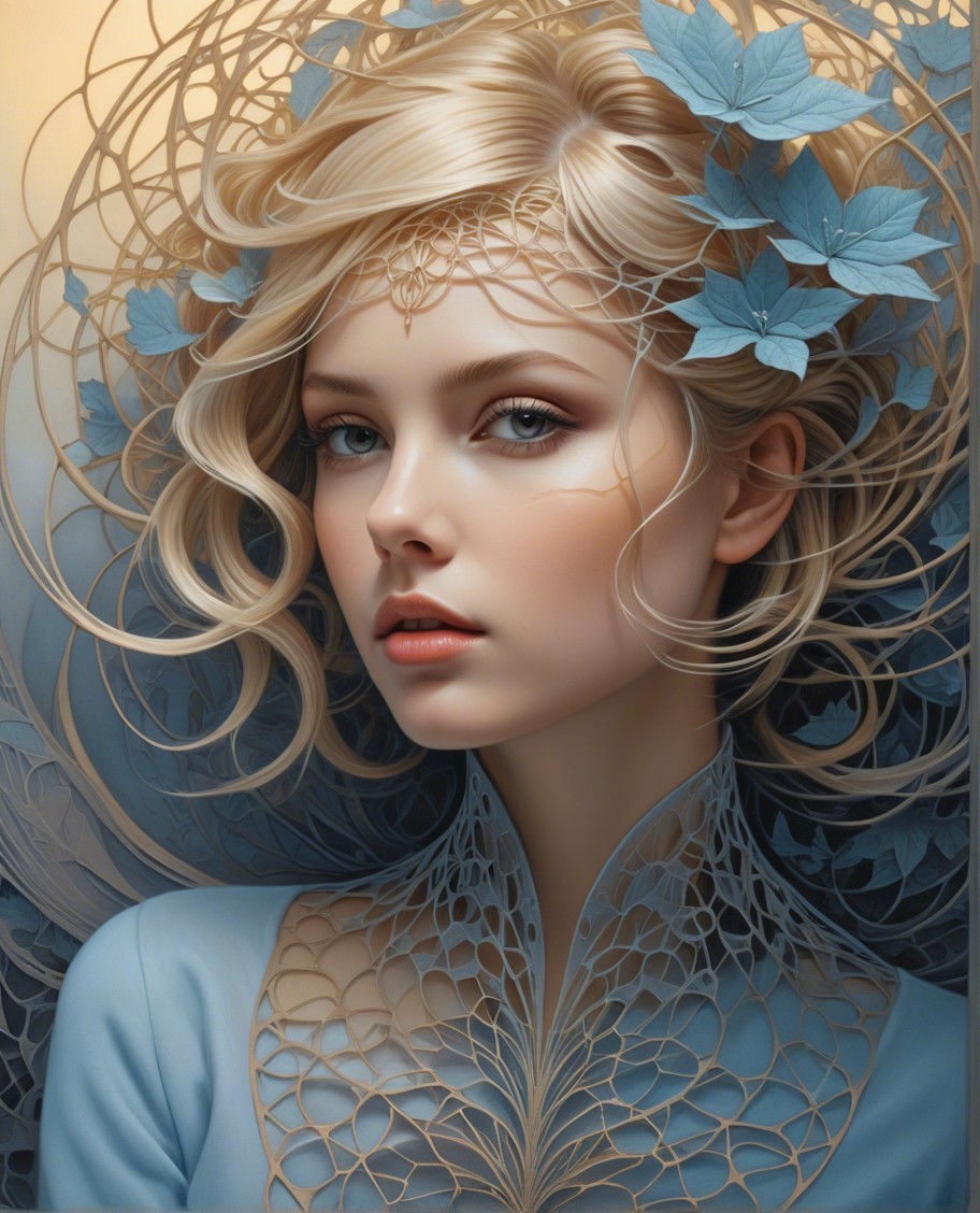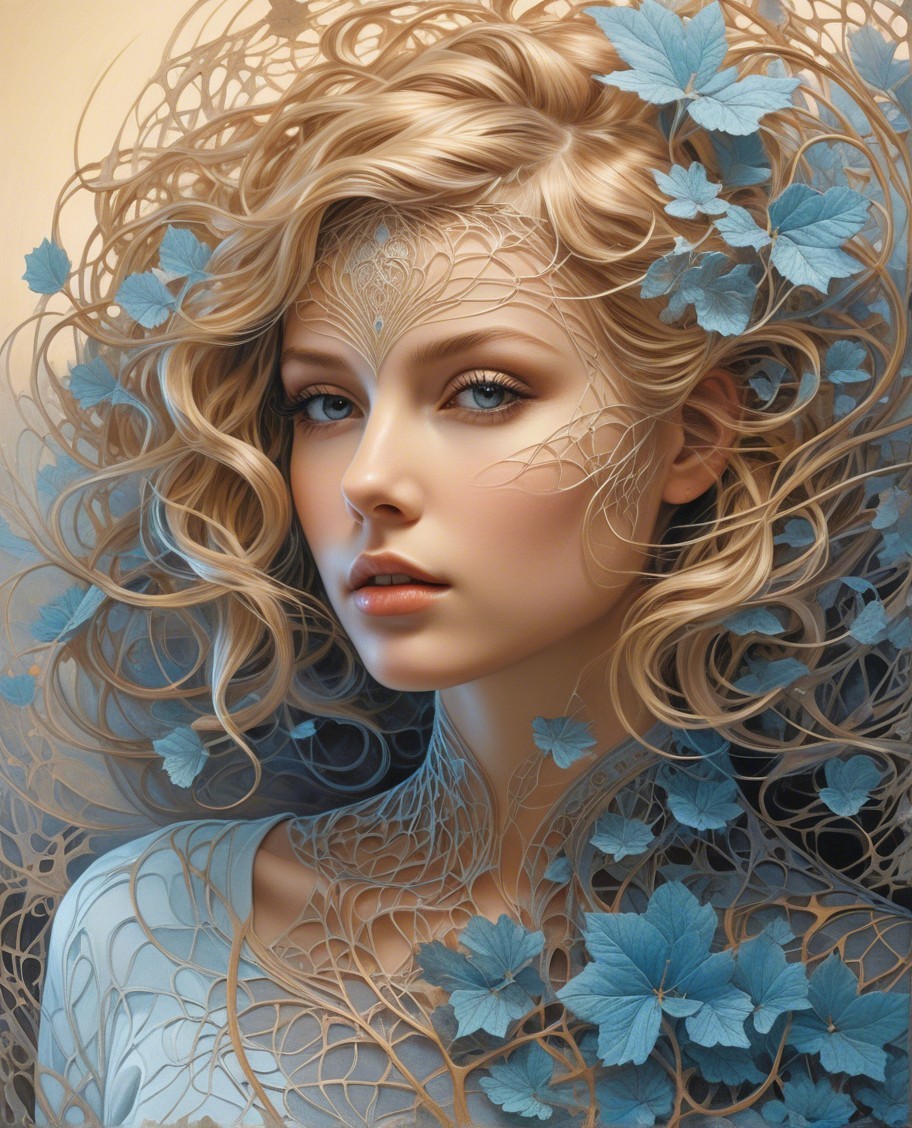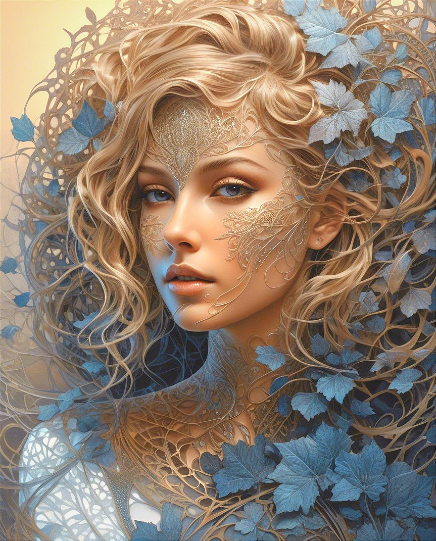 A mesmerizing portrait of a young woman with flowing, curly blonde hair adorned with delicate blue leaves. She wears an intricately patterned light blue garment, exuding an ethereal beauty.