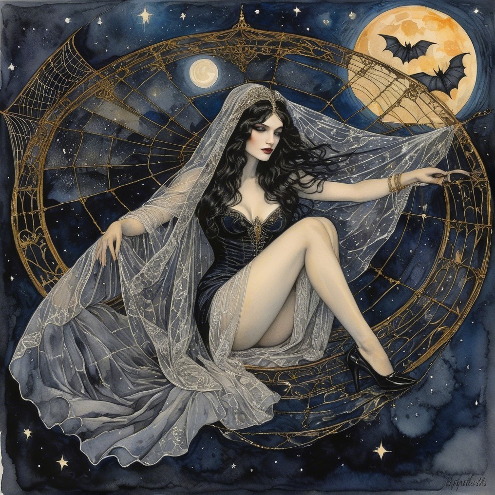 A beautiful figure in a black dress with lace, suspended in a dark sky filled with stars. She features bat-like wings, a web backdrop, and a mystical aura under the glowing moon and bats.