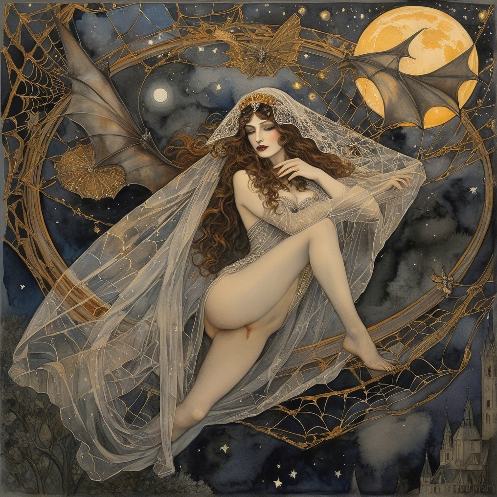 + Prompt:“angel of night, of history and death and of light”. Dark gothic gypsy sorcerer bat woman of the night, spider web veil, in the style of Wolfe Von Lenkiewicz ,style klimt e Van Gogh