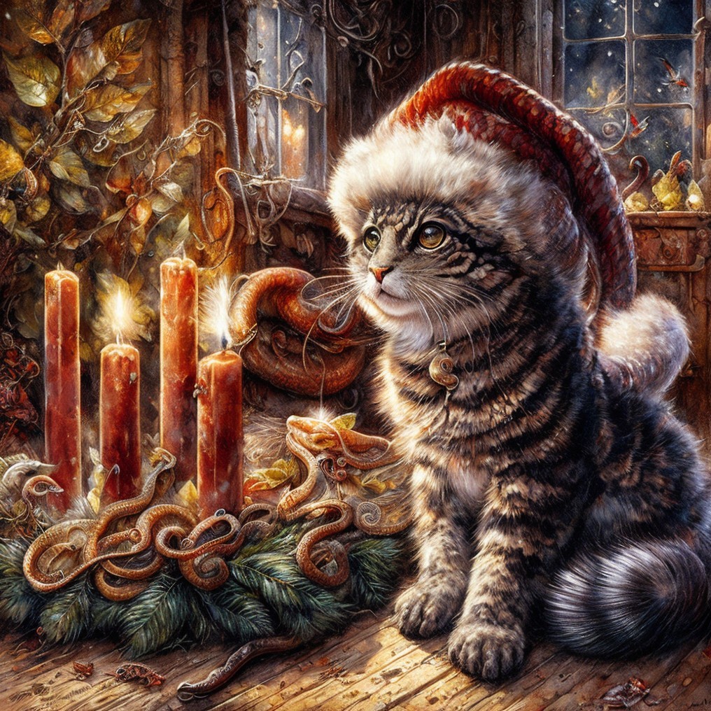 A mystical scene featuring a striped cat with ornate jewelry, surrounded by candles and entwined snakes in a dimly lit, rustic setting. Leaves and shadows create an enchanting atmosphere.