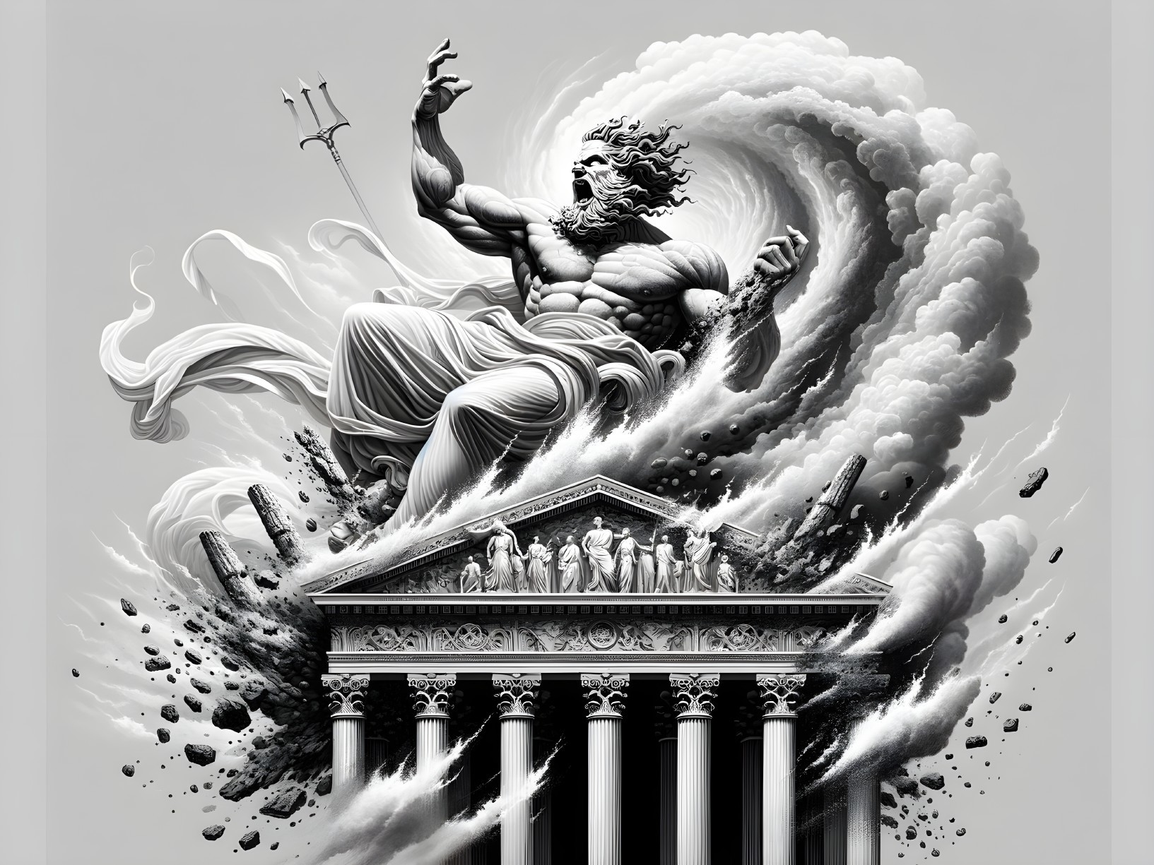 A monochromatic artwork depicting a muscular, bearded figure emerging from a tempest, towering over a classical Greek temple with figures.