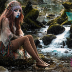 A young woman with flowing hair sits gracefully on a rock by a rushing stream, surrounded by colorful leaves and a serene forest backdrop, evoking a magical, ethereal atmosphere.