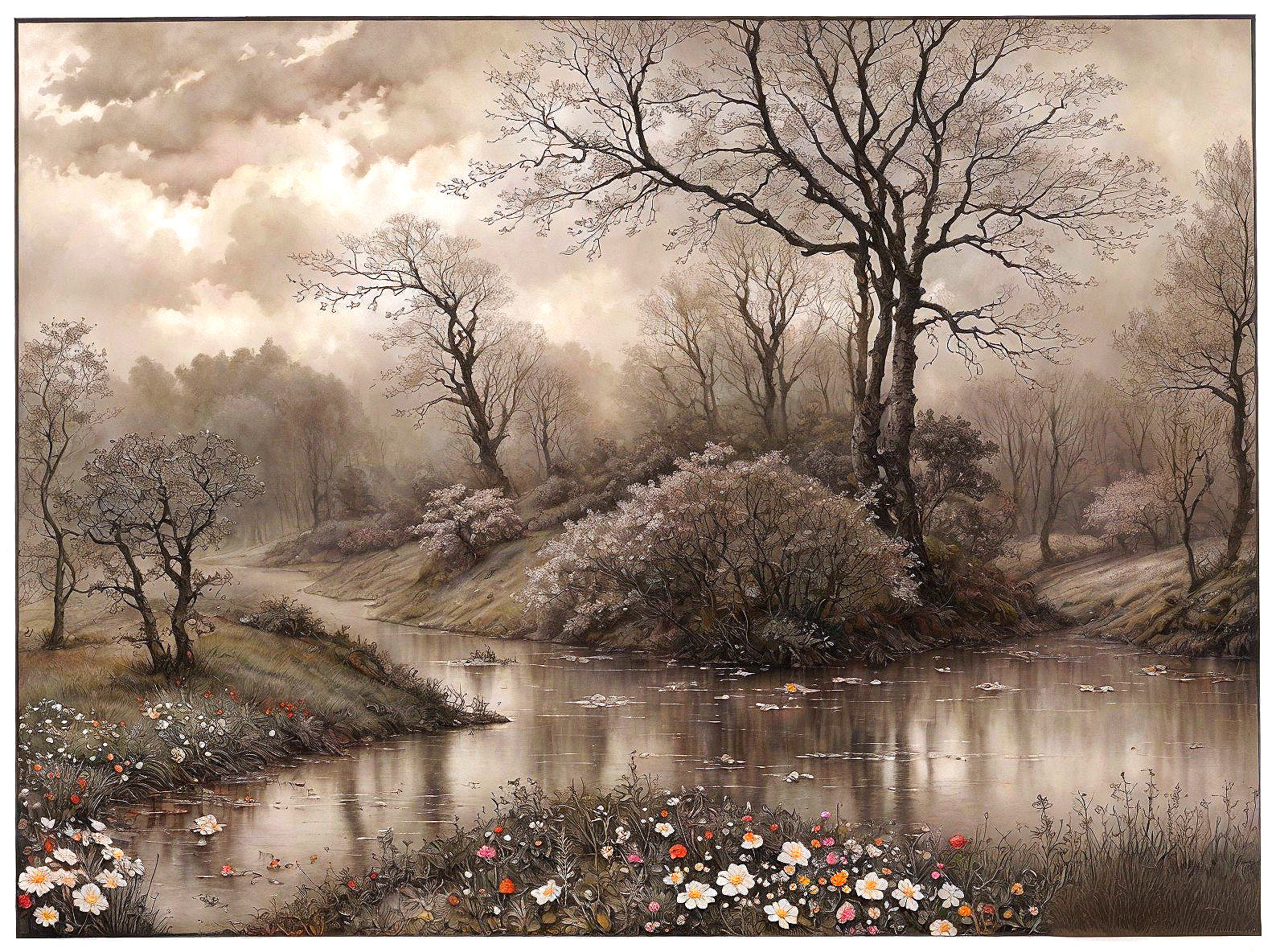 A serene landscape with a river, blooming trees, and flowers under a cloud-filled sky.