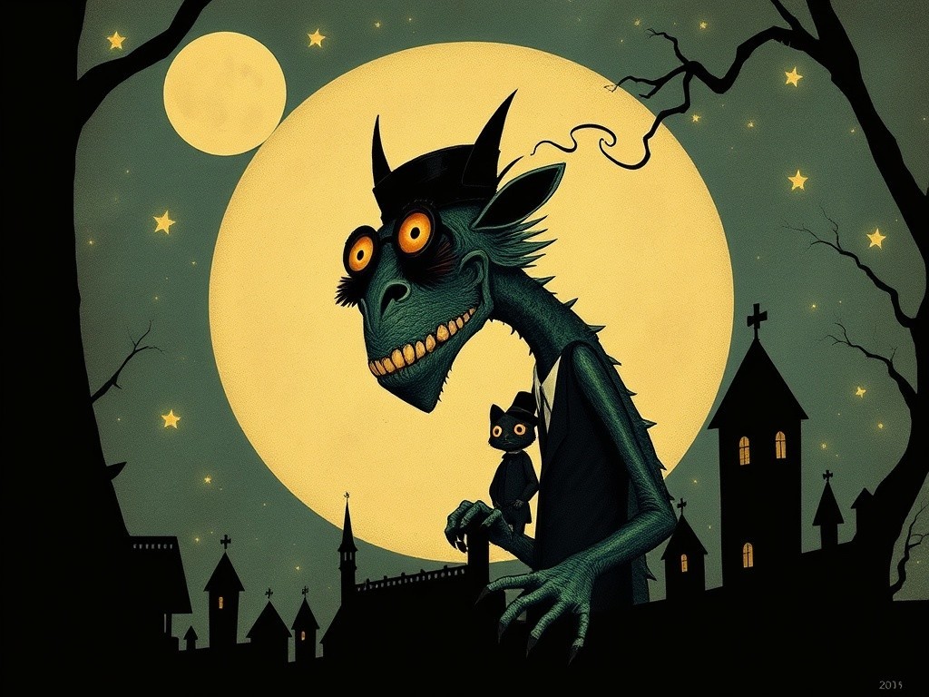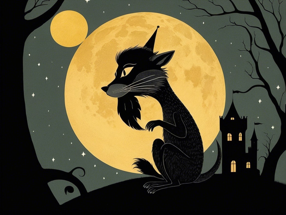 A stylized illustration of a woman with a bob haircut and a black cat, set against a yellow moon and dark foliage.