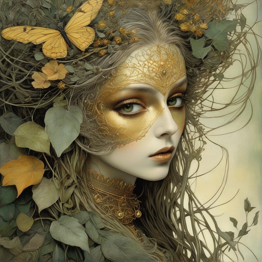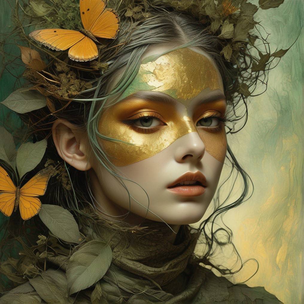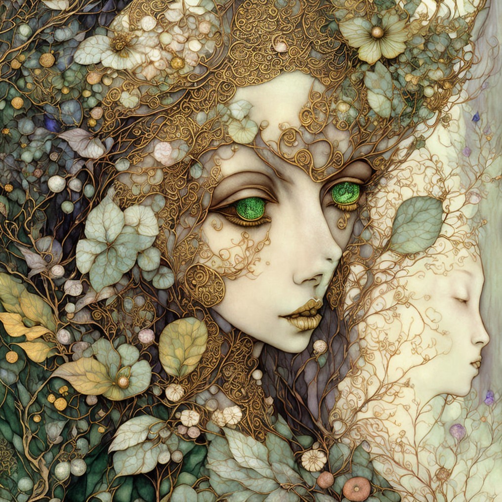 A woman with green hair and yellow makeup adorned with a floral and leafy headpiece, exuding a mystical, nature-inspired aura.