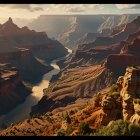 The image showcases a breathtaking canyon landscape, featuring steep, multicolored rock formations and a winding river reflecting the sky. The scene is illuminated by warm, golden sunlight.