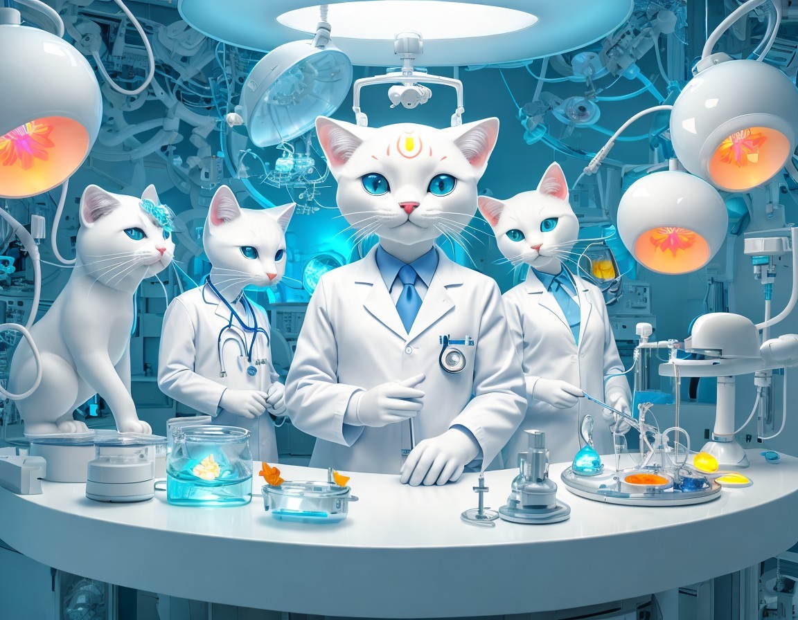 Four anthropomorphic cats in lab coats are in a futuristic lab, surrounded by scientific equipment and fish specimens.