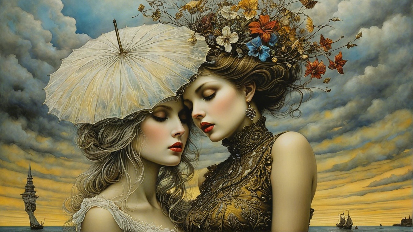 A serene woman adorned with butterflies and a flowing hairstyle stands against a dramatic backdrop of a moonlit sky and distant castle, blending nature with ethereal beauty.