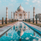 A vibrant, swirling depiction of the Taj Mahal, surrounded by colorful trees and a reflective waterbody. The sky bursts with hues of orange, blue, and purple, creating a dreamlike atmosphere.