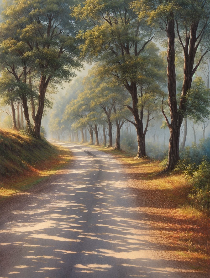 Two people walk on a sunlit path on a serene country road, with towering trees and a soft mist in the air.