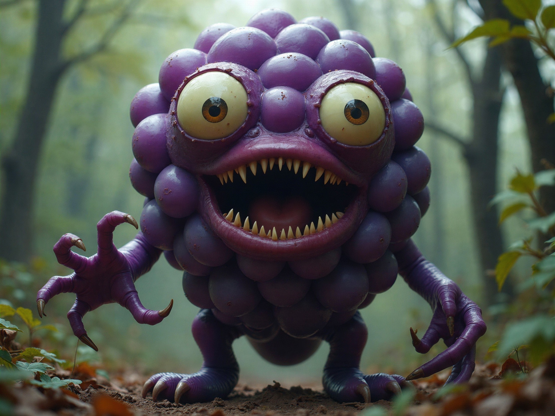 A low-angle shot captures a monstrous figure resembling a bunch of grapes, with a large, squat body covered in individual purple grape-like spheres, each with tiny dust speckles. The creature's head is fused with its body, featuring two disturbingly large, yellowish eyes with dark brown ir