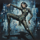 The image depicts a graceful woman posing against a textured wall, her body partially covered in intricate black line patterns. The blend of muted colors creates a striking, artistic effect.