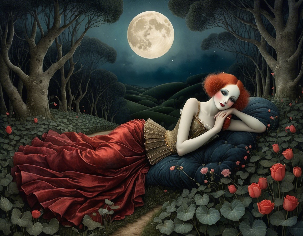 A whimsical figure in a red and black gown lies in a dreamy forest, surrounded by hearts and roses. The full moon casts a mystical glow over the serene, enchanting scene.