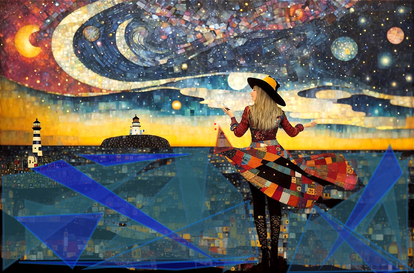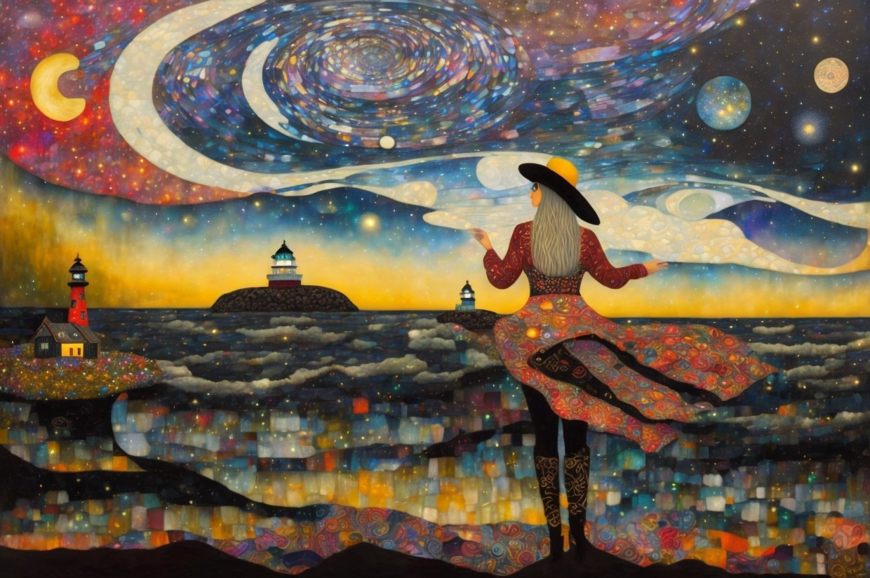 A person in a witch costume stands before a surreal seascape with fantastical elements, such as multiple planets and a swirling galaxy overhead. The ocean is behaving very childish, because it has snorted too much fish oil.