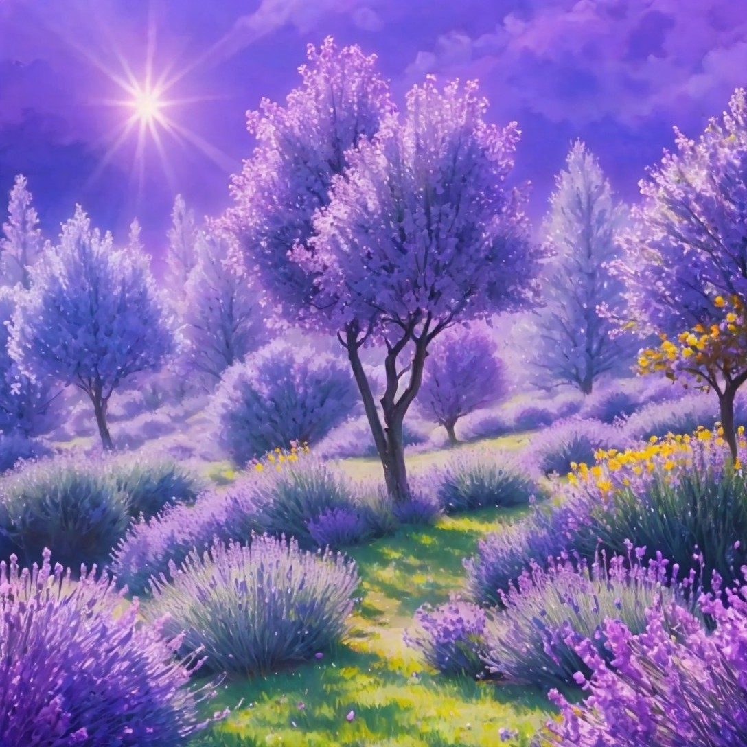 A picturesque lavender field basks in the radiant glow of a setting sun, amidst a serene purple-tinted landscape.