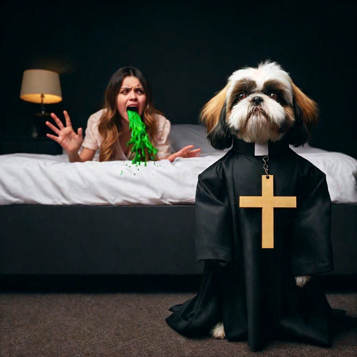 This was supposed to be a parody of The Exorcist: A cute Shih-Tzu dressed up as a priest in the movie The Exorcist and exorcising a demon out of a girl floating and vomiting green vomit in bed