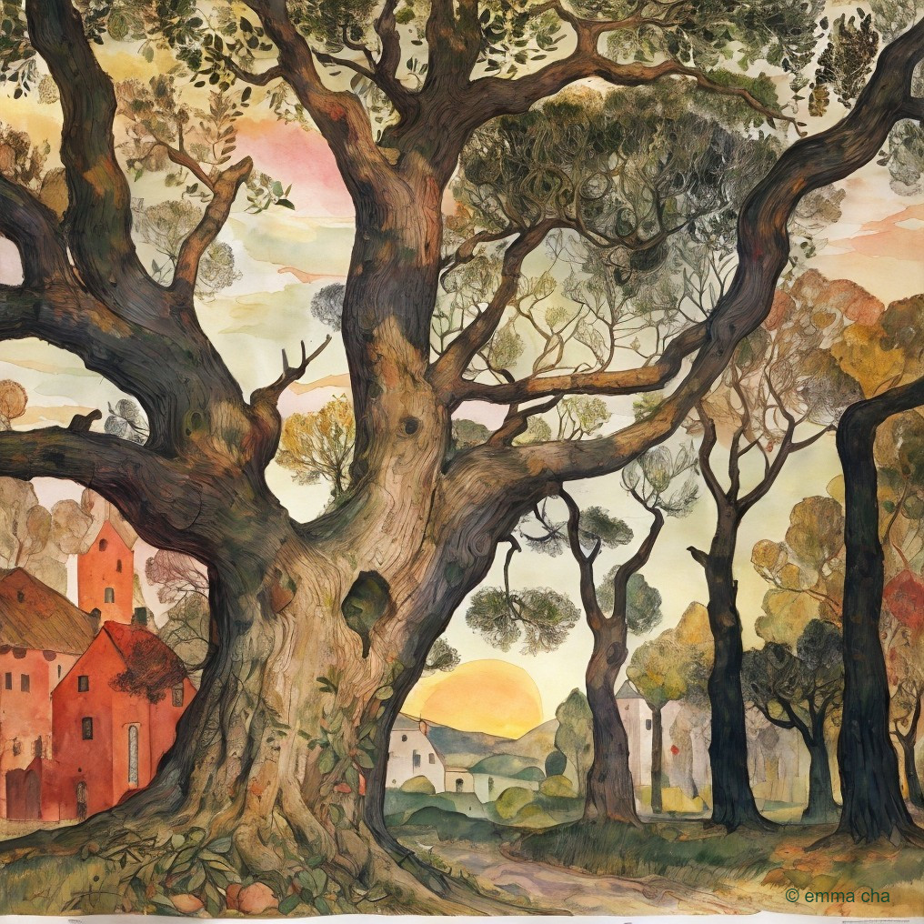 An artistic painting depicting a rustic scene with a sprawling tree in the foreground and houses amidst rolling hills and trees at sunset.
