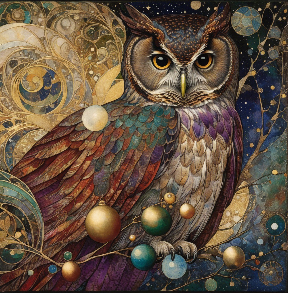 A majestic owl perches on a branch, adorned with vibrant feathers. The background features swirling cosmic patterns and celestial elements, enhancing the owl's mystical aura.