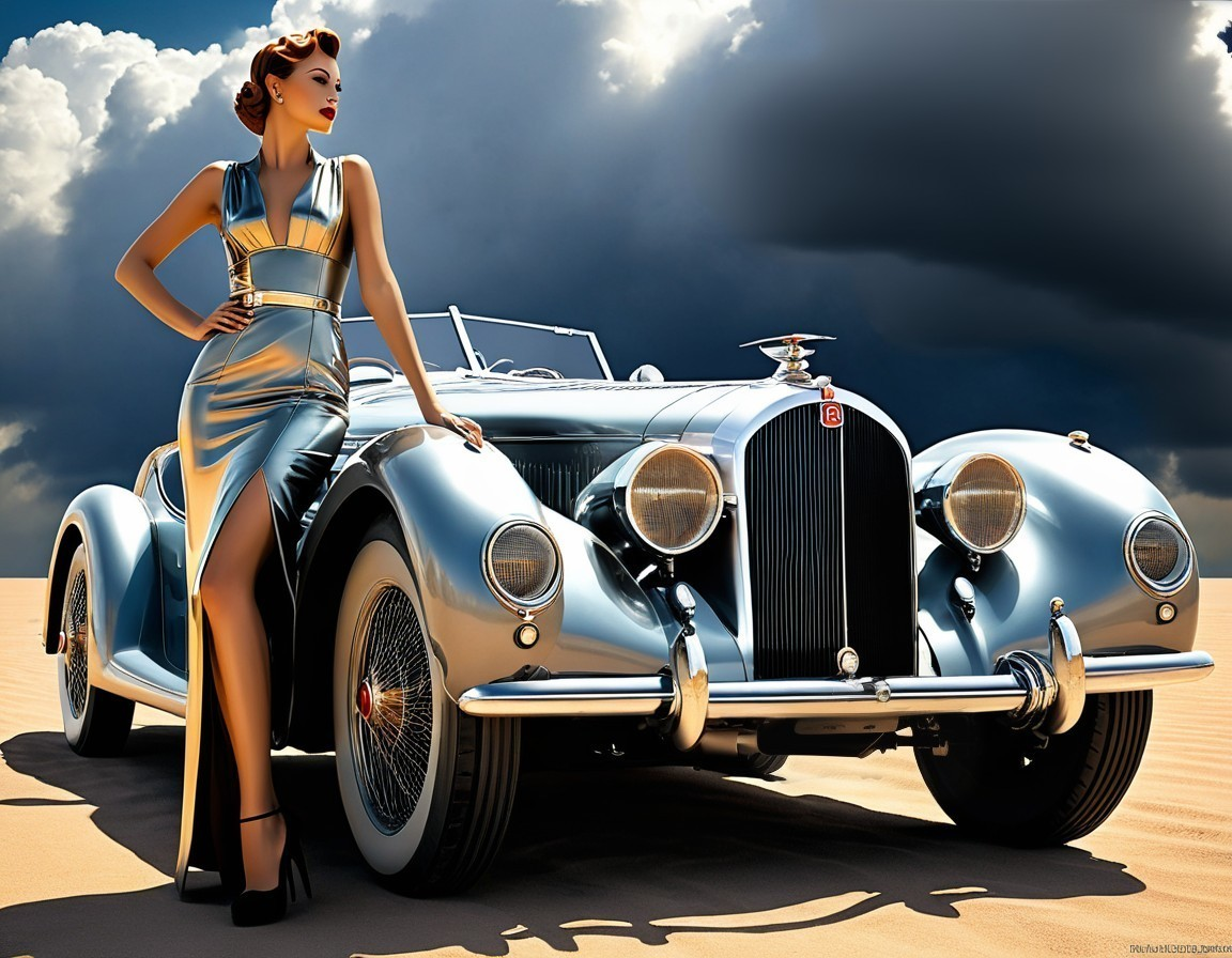 A stylish woman in a sleek, silver dress poses next to a classic silver convertible car against a dramatic cloudy sky, evoking a vintage glamour aesthetic.