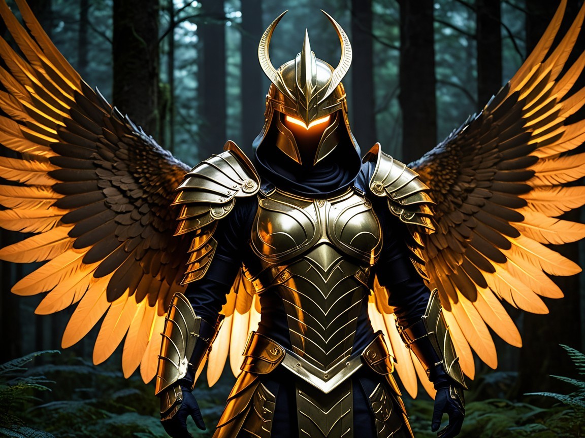 In a mystical forest, an armored figure radiates power, with glowing orange eyes and dark metallic wings. Surrounded by a fiery ring, it embodies the duality of light and darkness, inviting exploration.