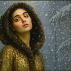 Prompt: detailed wintry landscape painting by John William Waterhouse, Audrey Hepburn, 24 standing in snow-covered forest clearing, snow flakes falling everywhere. beautiful tall young fashion model, hands clasped in front, head tilted backward, soulful expression facing the viewer directly, beautiful face, floor length hooded haute couture long metallic gold embroidered damask gown, hem trimmed with dark brown fur, long fur trimmed sleeves, capes hood lined with dark fur,