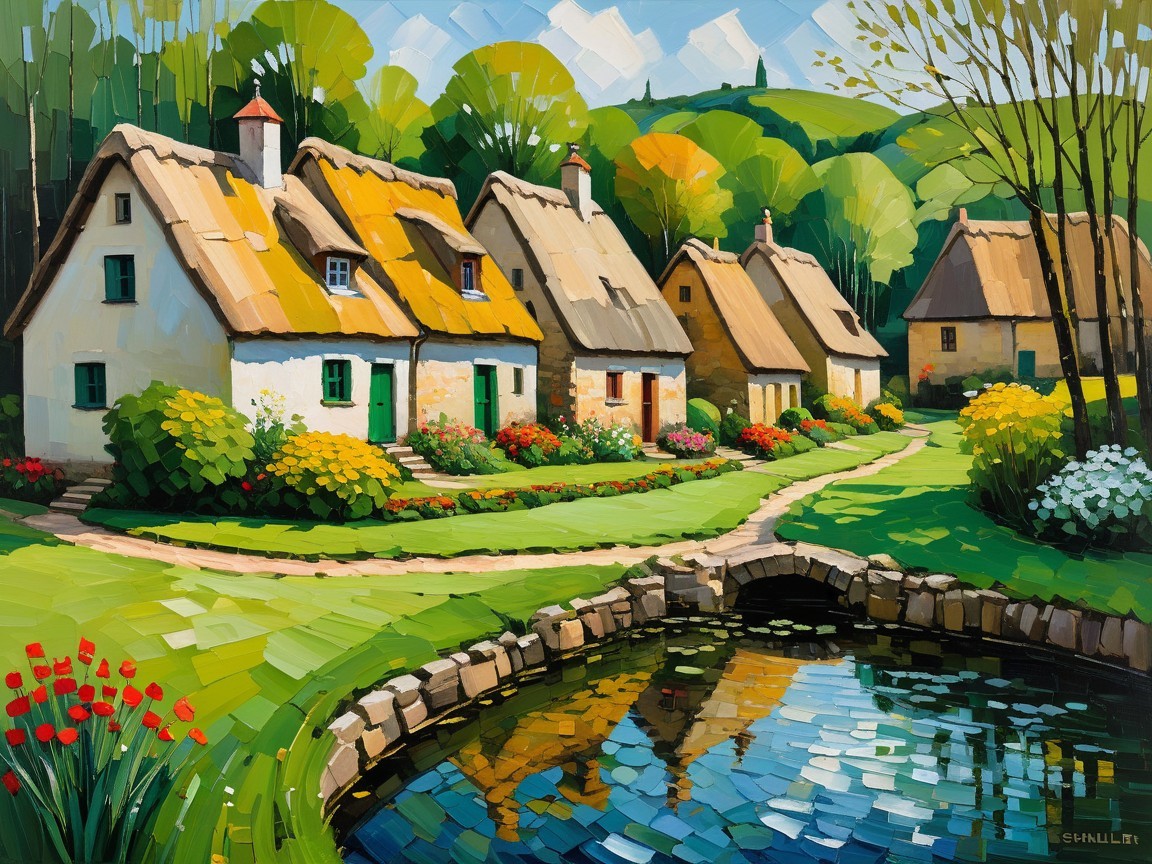 A vibrant, colorful landscape featuring charming cottages with thatched roofs, surrounded by lush greenery and blooming flowers. A pretty spring-fed pond reflects the picturesque scene.