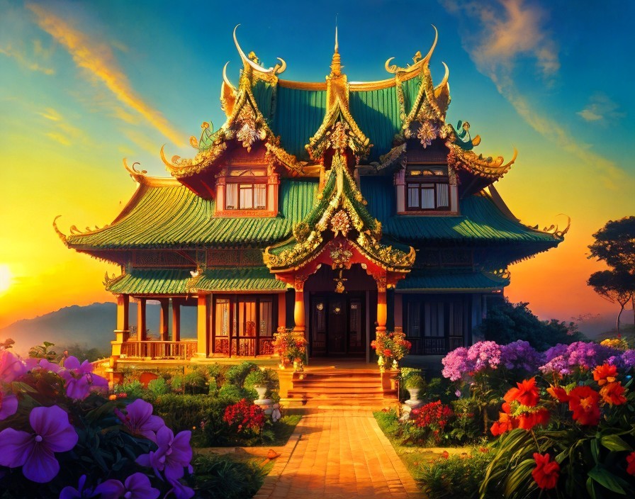 A vibrant painting of a sunset over a tranquil river with reflection, surrounded by trees and blooming flowers.