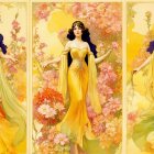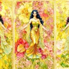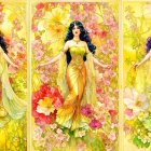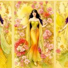 The image features three enchanting women in long, flowing gowns adorned with floral patterns. Each gown transitions through vibrant colors—orange, yellow, and green—set against lush backdrops of blossoms.