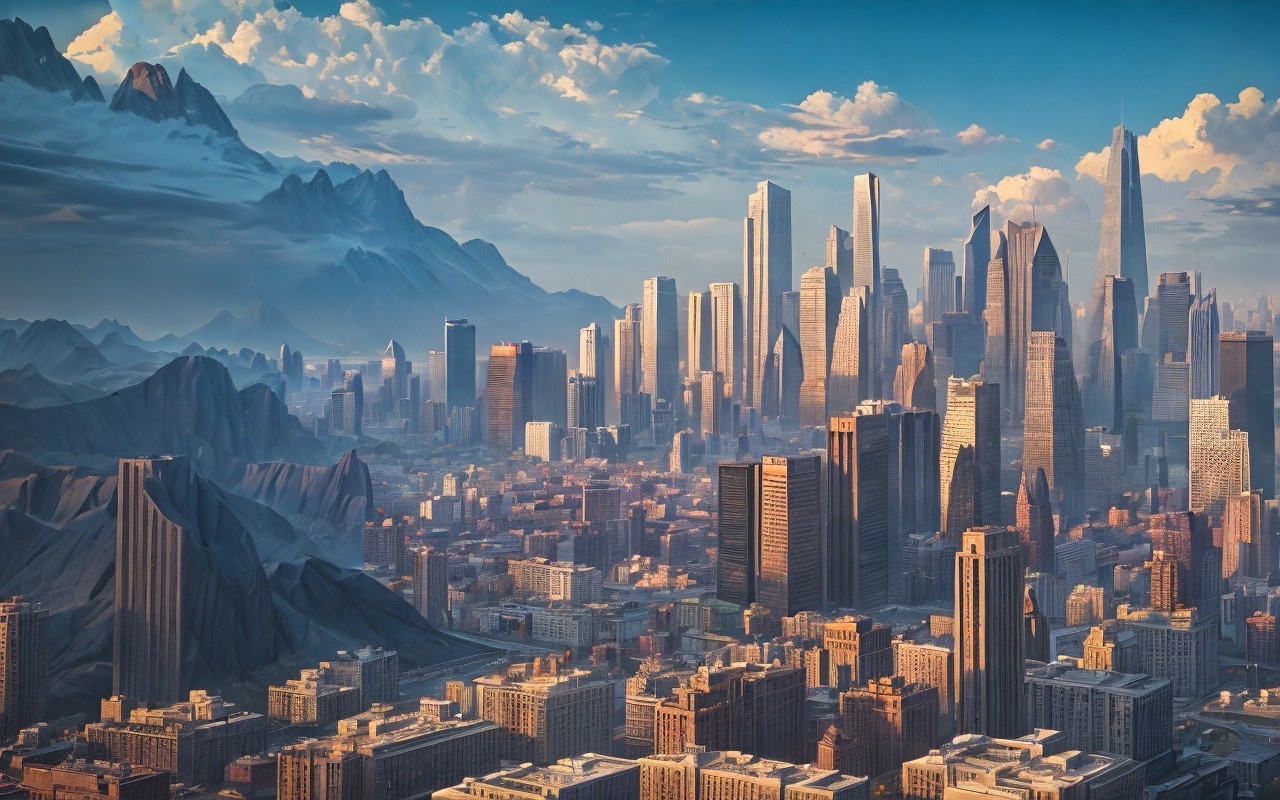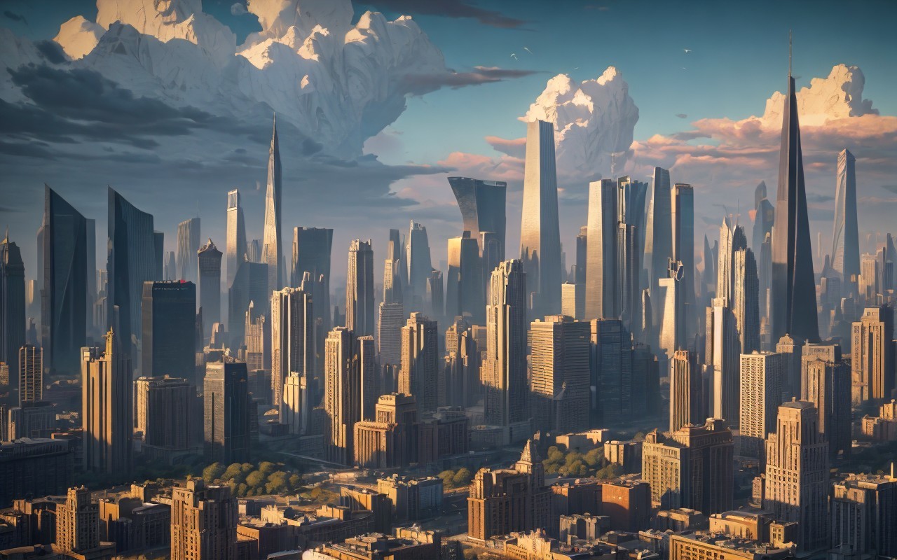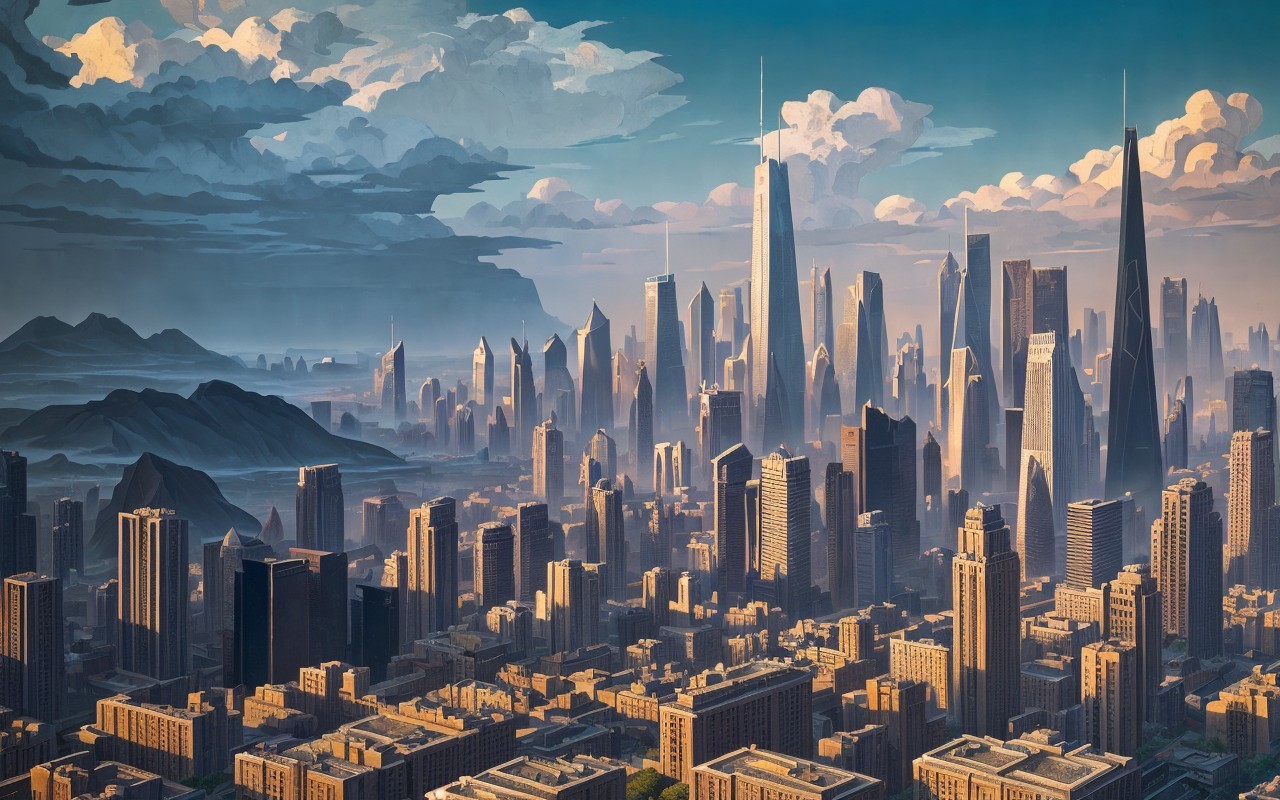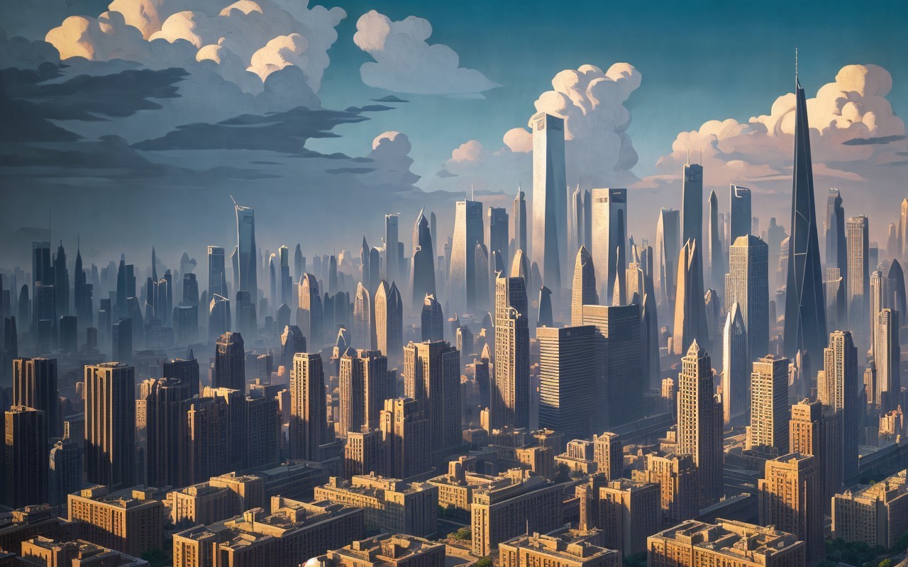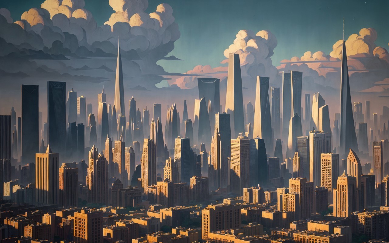 brutalism city skyline, lightning, in the style of Nicholas Roerich