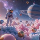 An astronaut stands amidst colorful, fluffy clouds, surrounded by shimmering spheres and a vibrant cosmic landscape featuring a massive, ringed planet and a backdrop of stars and galaxies.