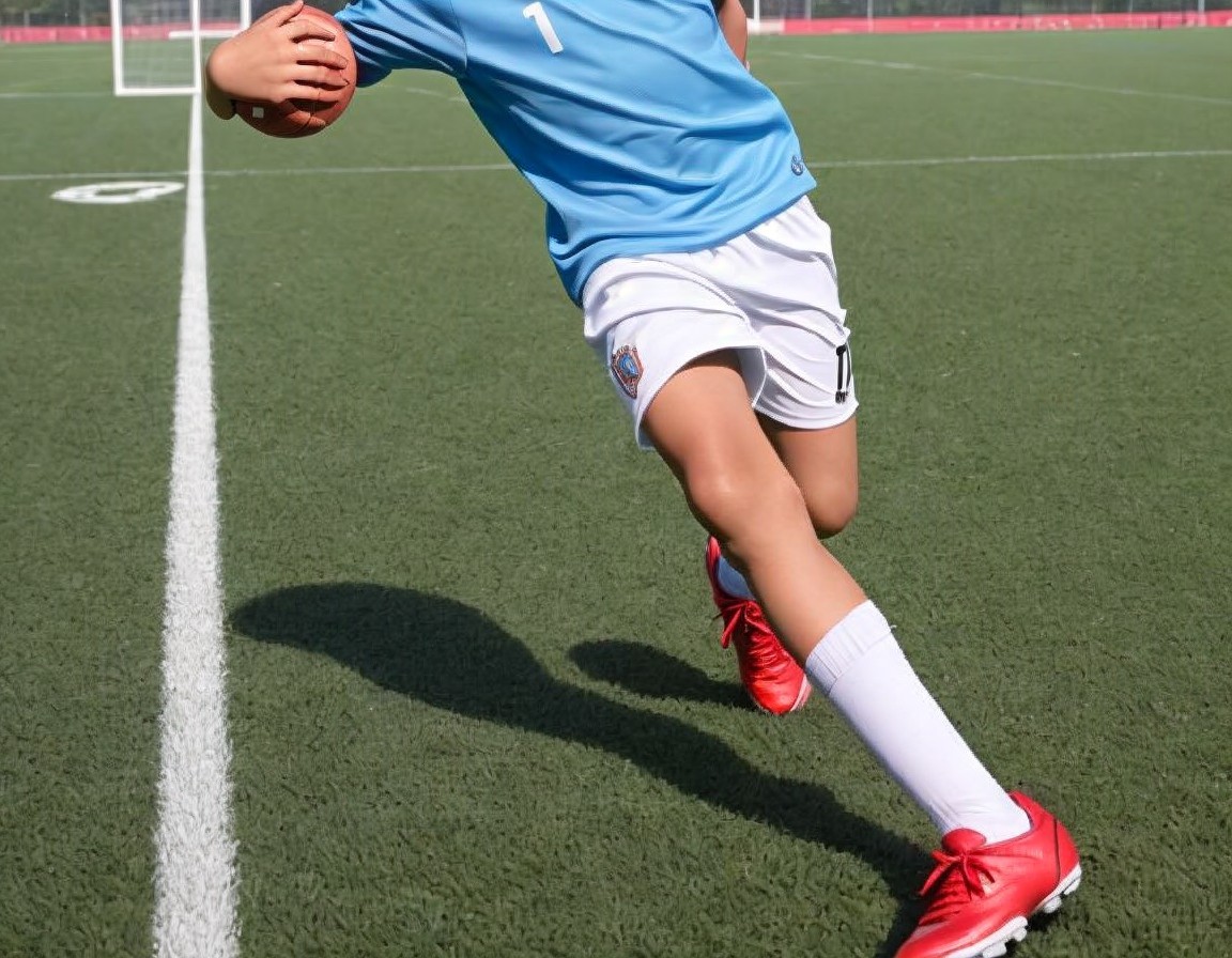 A soccer player in a blue jersey and white shorts dribbles a bright orange ball on a green field, showcasing dynamic movement and athletic energy.