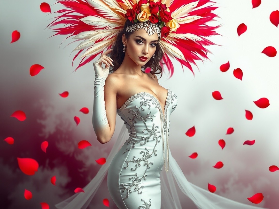 A striking female figure in a flowing white gown adorned with intricate embroidery and beading exudes elegance. Her dramatic feathered headdress and bold makeup enhance her porcelain skin, creating a captivating aura. Surrounded by drifting rose petals, the scene radiates romance and celebration.