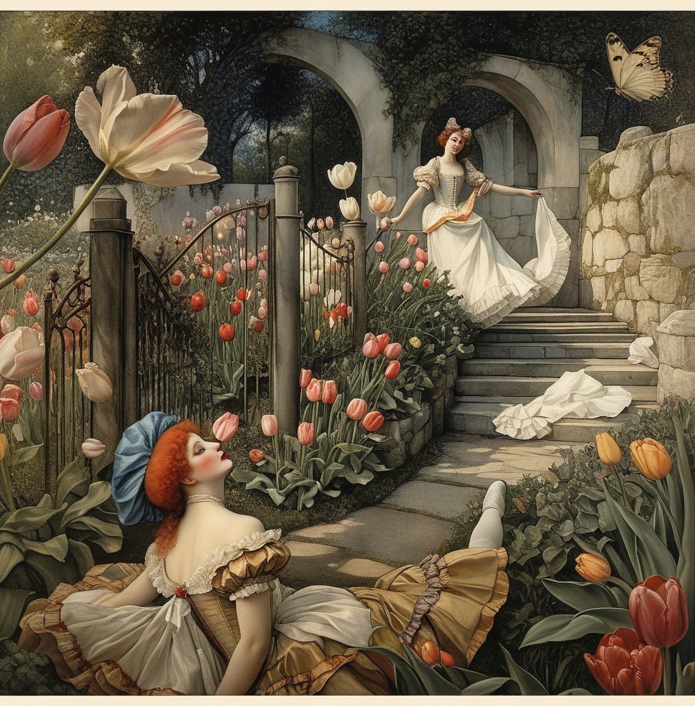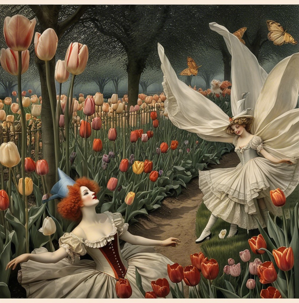 A woman in a historical costume sits among vibrant tulips, holding a flower. She wears a white fan behind her, with a whimsical expression, blending elegance and nature beautifully.