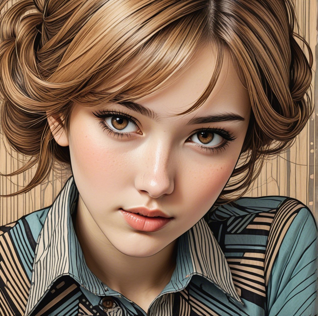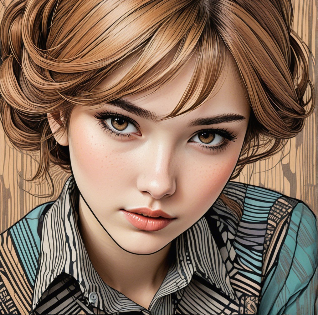 Stylized Portraiture with intricate black line patterns, Stylized woodblock print, Comic book art merged with storybook illustration, beautiful teenage temptress in blouse with collar, stacked-up lines, crackles, close-up illustration with squiggly brushstrokes:, brown stylized hair, colored line drawing, line patterns in hues, dyed, tiny lines, brown pastel colors using graphite and charcoal, wavery coloured paint. Intricate line art, 1970s adult comic book art, stylized fabric textures, Contouring outlines,