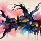 This vibrant abstract painting features swirling black lines and a mix of colorful splashes in pink, blue, and gold. Circular shapes add depth, creating a dynamic and captivating composition.