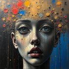 The image features a striking portrait of a young woman with large, expressive eyes and bold, geometric patterns on her face and head, showcasing a blend of colors and an intriguing artistic style.
