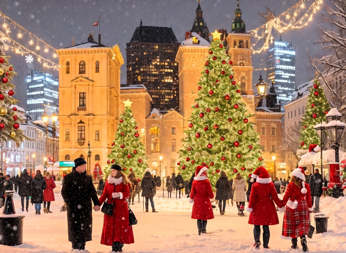 A festive winter scene features people in red coats and Santa hats walking amidst beautifully decorated Christmas trees, snow, and twinkling lights, set against a charming city backdrop.