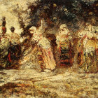 Five women in colorful, traditional dresses pose by the water, embodying distinct styles. They stand on rocks, surrounded by nature, with the sky and sea stretching behind them.