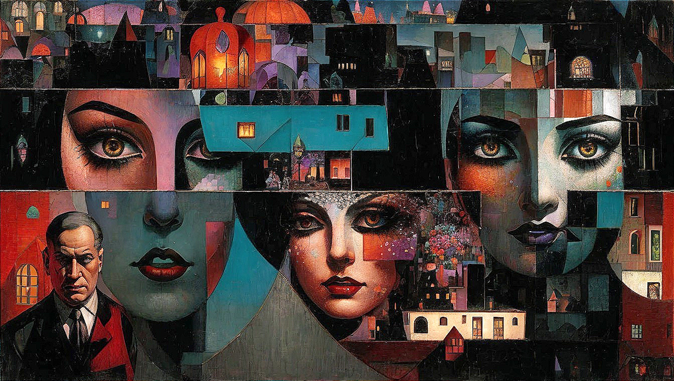 This striking artwork features a collage of faces with intense eyes, set against a vibrant cityscape. The use of bold colors and geometric shapes creates a mysterious, dreamlike atmosphere.