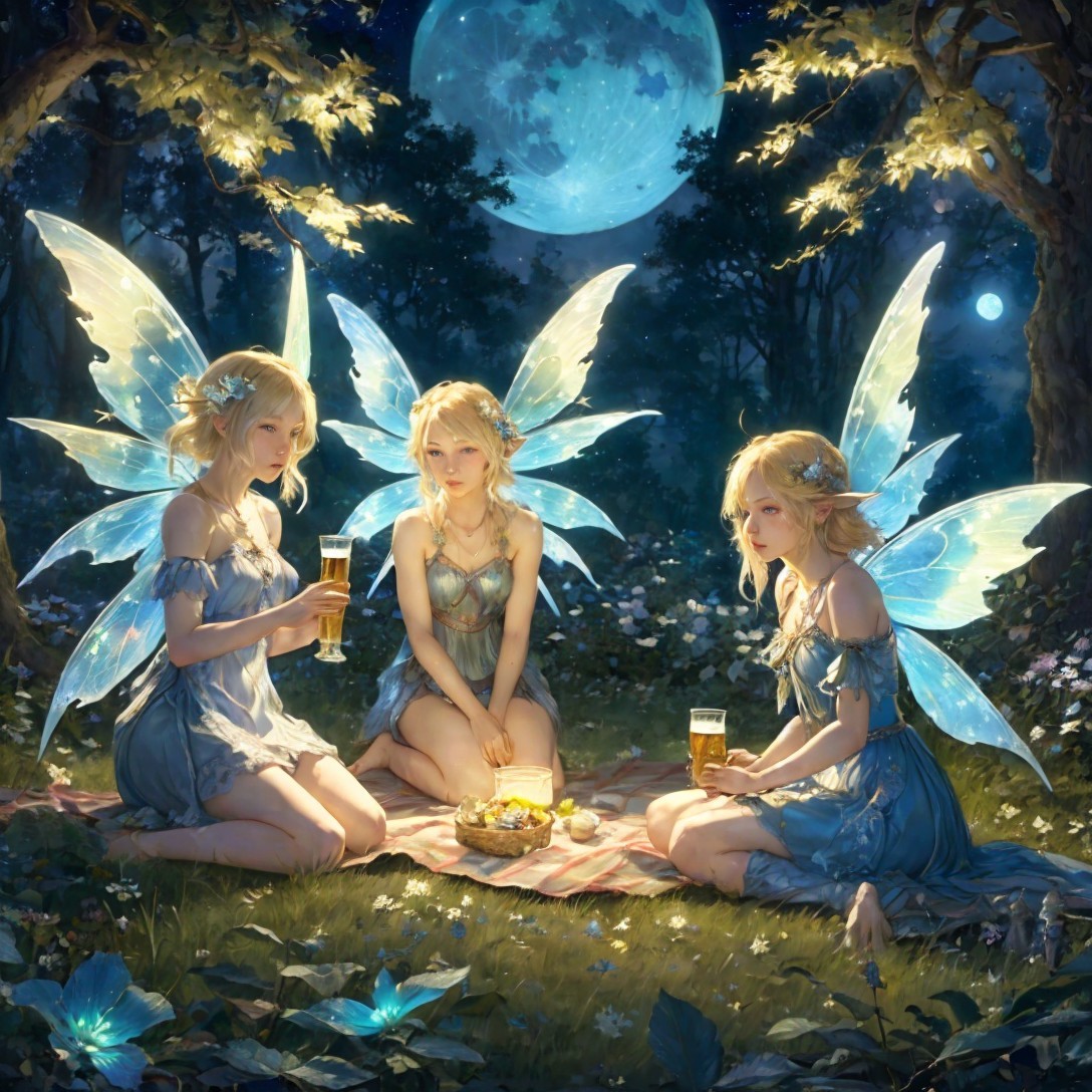 Fairies Picnic Under Moonlight with Vibrant Flowers