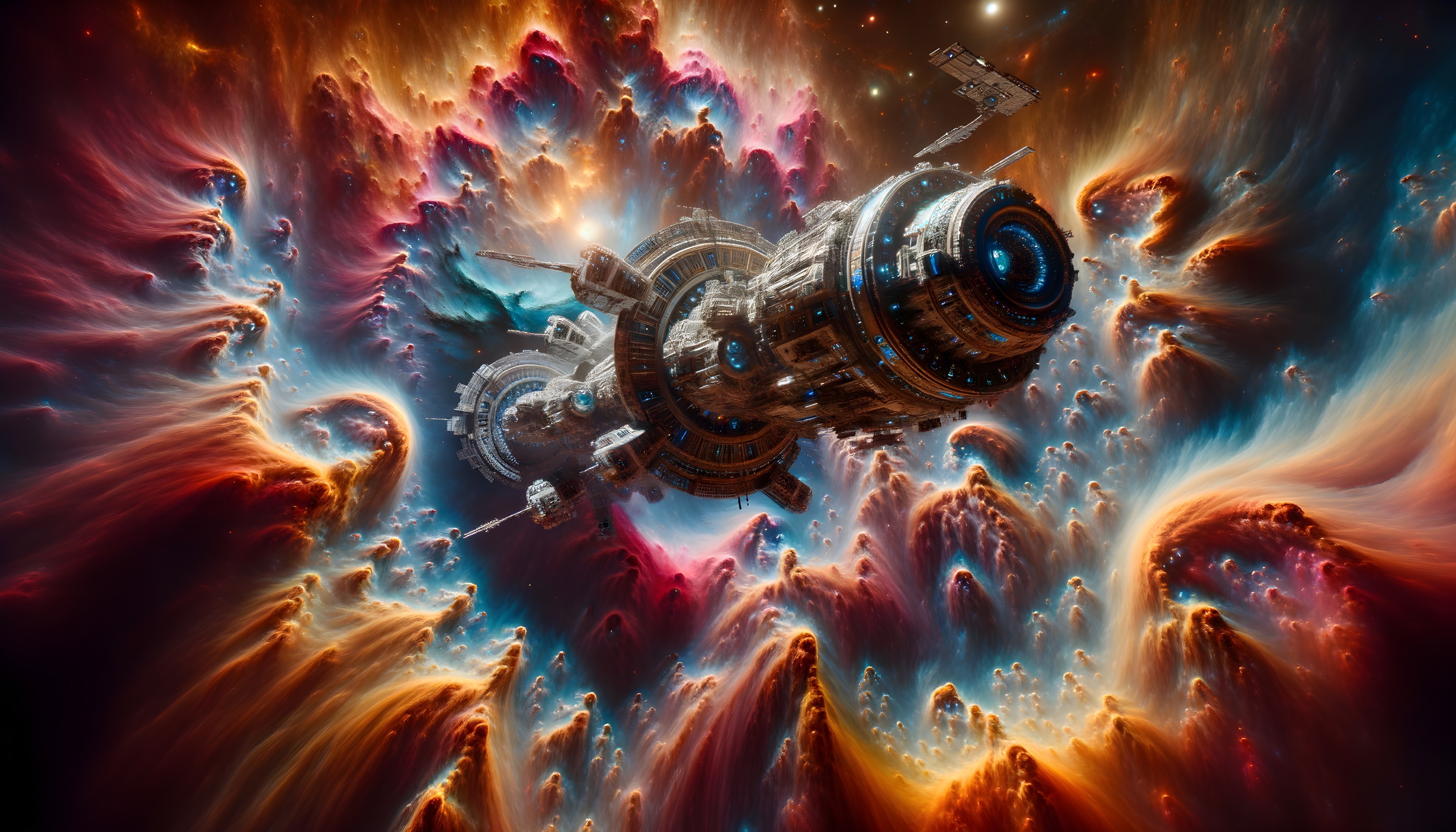 Detailed Space Station Floating Amidst Vibrant Nebula