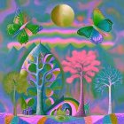 A vibrant, surreal landscape filled with stylized trees in various colors, set against a colorful sky with a golden sun and abstract patterns. The scene radiates a whimsical and dreamlike atmosphere.