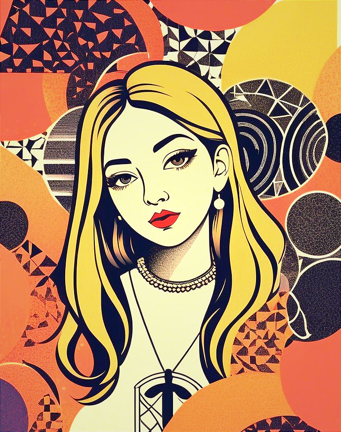 A stylized portrait of a woman with long blonde hair, wearing bold earrings. The background features vibrant circles and geometric patterns in warm colors, creating a retro artistic vibe.
