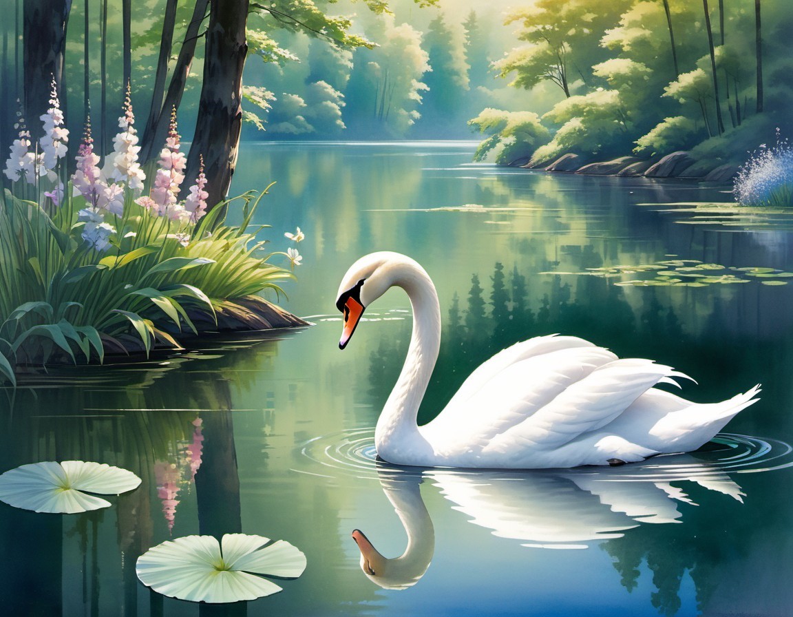 Li Cheng, Guo Xi, Yokoyama Taikan style: a graceful swan in a beautiful pure lake and the swan's reflection on the rippled water surface. In the background - forest, meadow, wild flowers on the shore of the lake.piritual essence of nature, Mourou-tai technique,subtle gradations of color