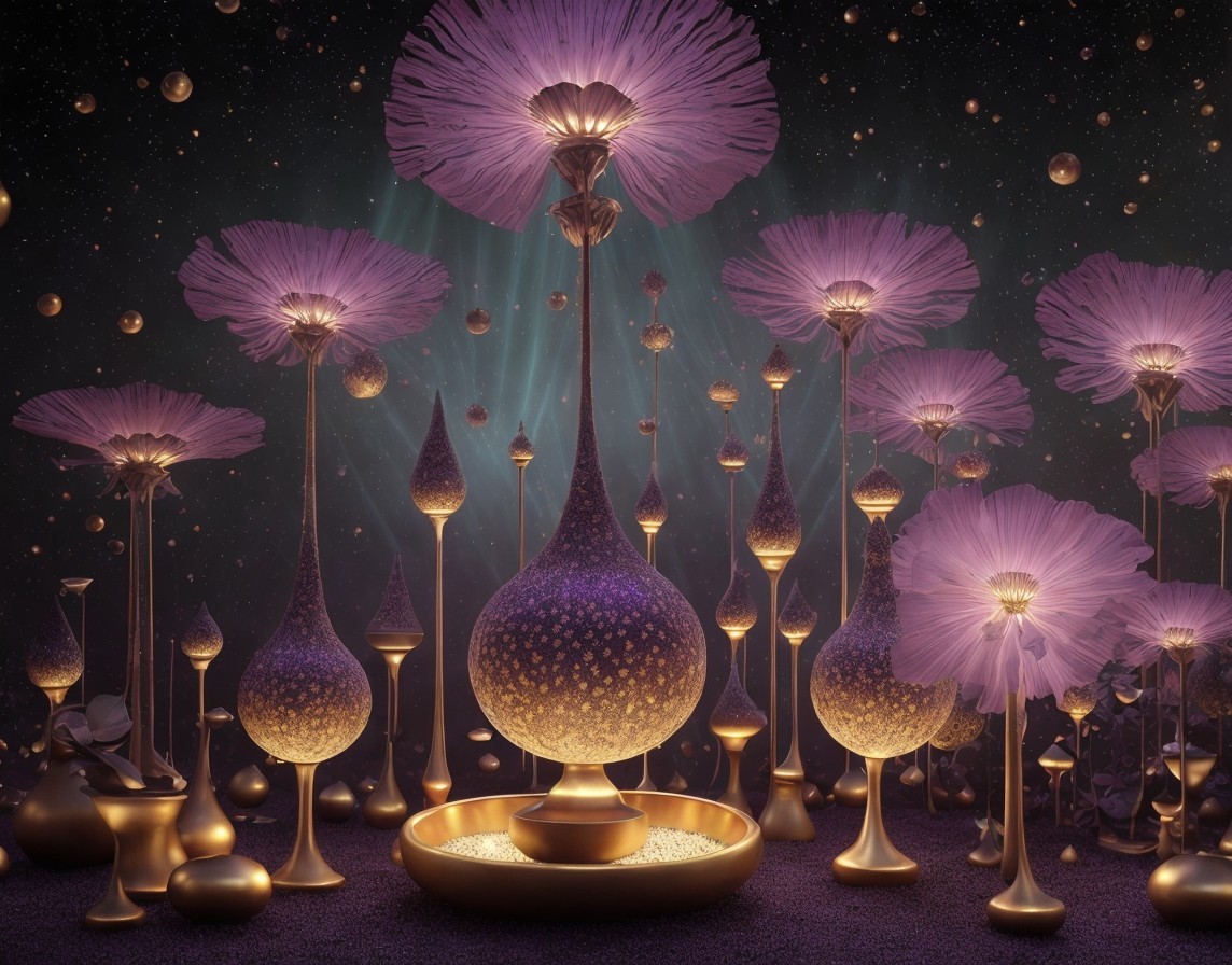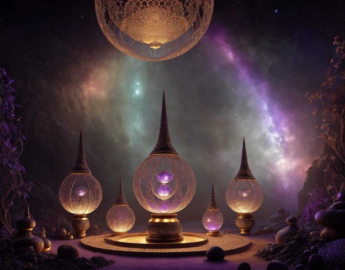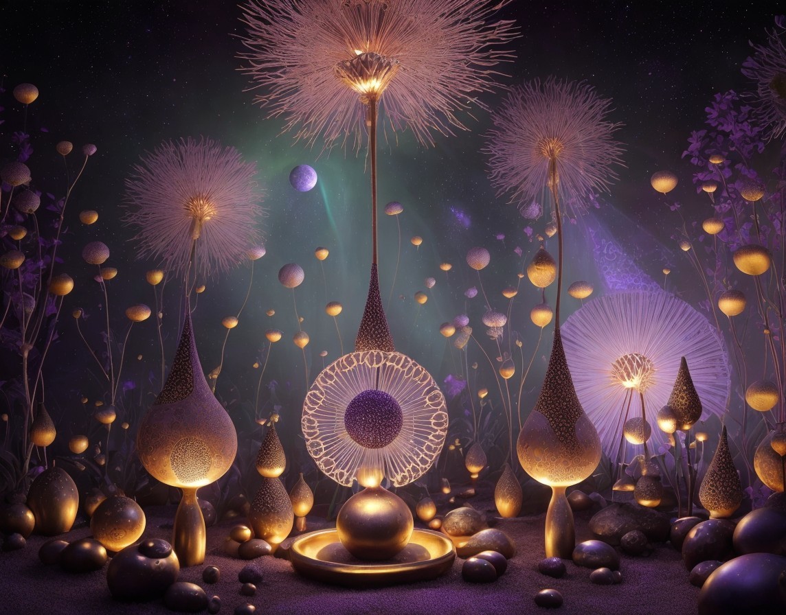 Ornate opium poppy seed pods, cosmic zen garden setting, galactic backdrop, opium paradise theme, intricate geometric patterns, hyperrealistic details, mystical ambiance, serene and tranquil, cosmic elements, opulent color palette with deep purples, rich reds, and golden hues, soft ambient lighting, surreal and enchanting atmosphere, digital artwork, high-resolution, by Escher and H.R. Giger, ArtStation.