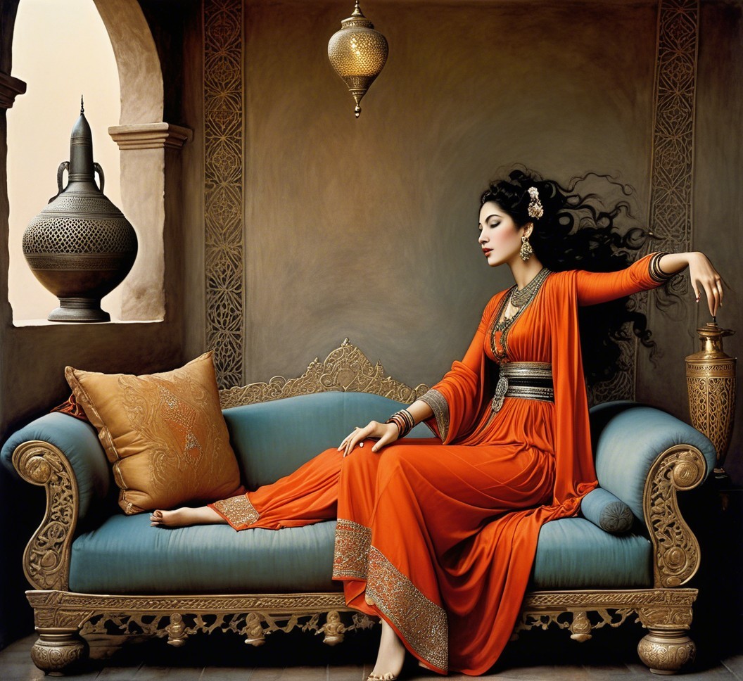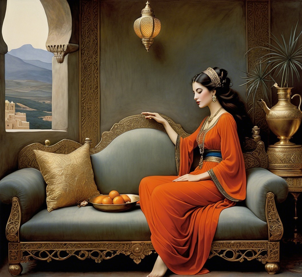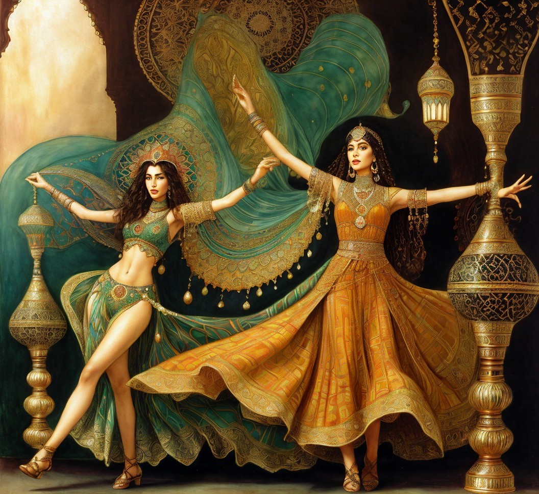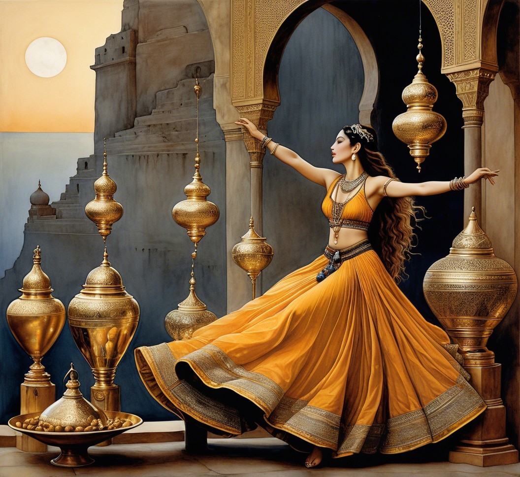 A graceful dancer in a vibrant yellow outfit twirls against a backdrop of ornate arches and decorative vases, illuminated by a glowing full moon over a serene sea.