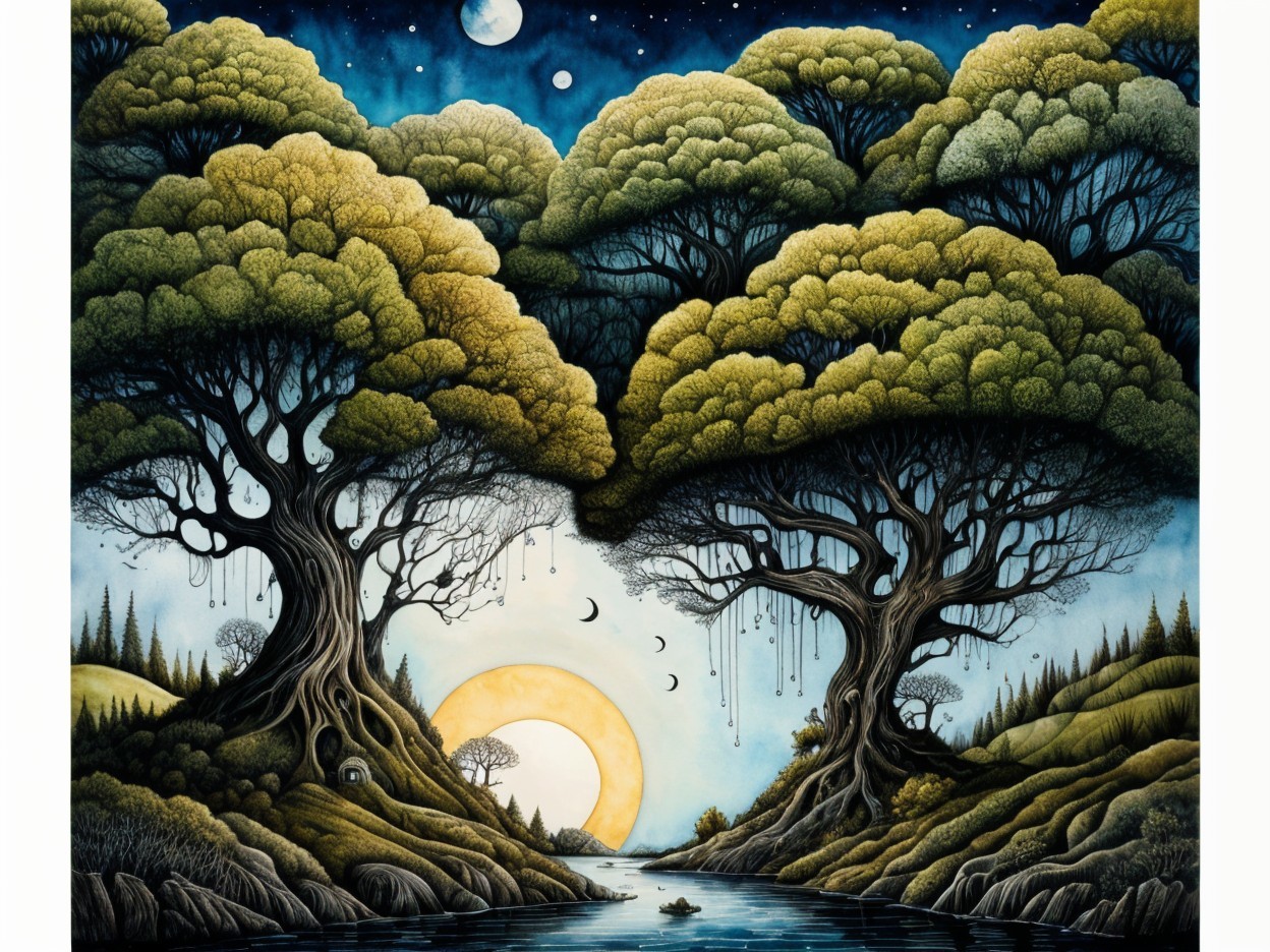 The image features two majestic trees with golden foliage, set against a serene landscape. A tranquil river flows between them, reflecting a night sky adorned with stars and a glowing moon